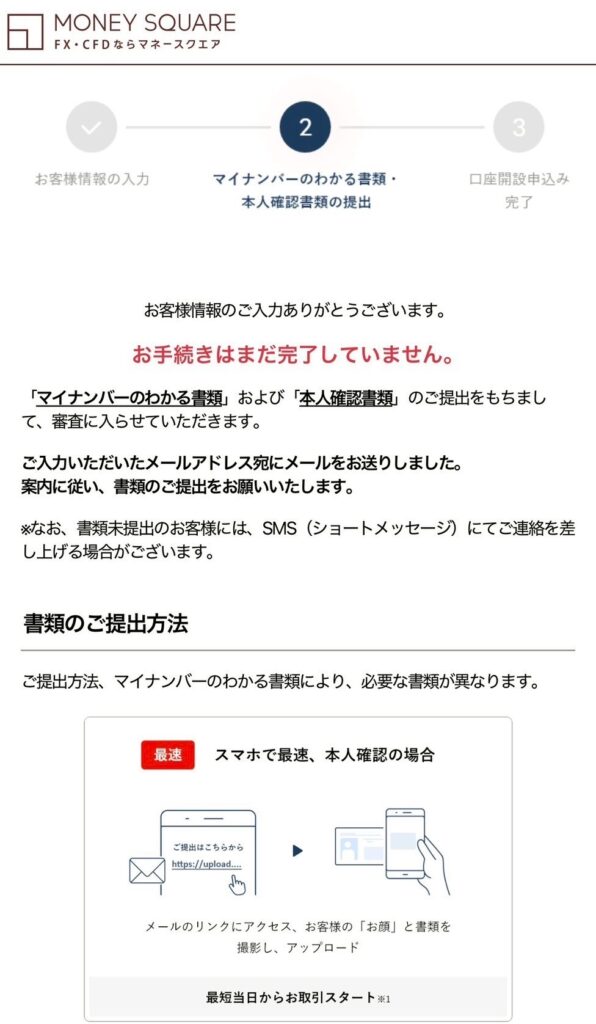 入力したメールアドレス宛に本人確認用のリンクが送信されるので、画面に従って運転免許証やマイナンバーカードなどの本人確認書類、及びマイナンバー確認書類をアップロードします。