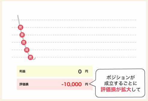 トラリピは戦略上、相場の上昇と下落、両方の値動きが必要で、一方向に大きく相場が動く「トレンド相場」では含み損が拡大するリスクがあります。