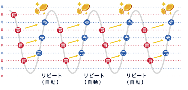 簡単に言えば、「あらかじめ設定した範囲で為替が動いたら、自動で買ったり売ったりして利益を積み上げてくれるしくみ」です。