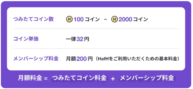 HafHの月額料金は、つみたてコイン料金(1コインあたり32円)+メンバーシップ料金(200円)で決まるよ。