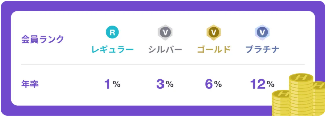 会員ランク(継続期間に応じてアップ)によってボーナス率が異なり、最大で年率12%のボーナスコインが付きます。